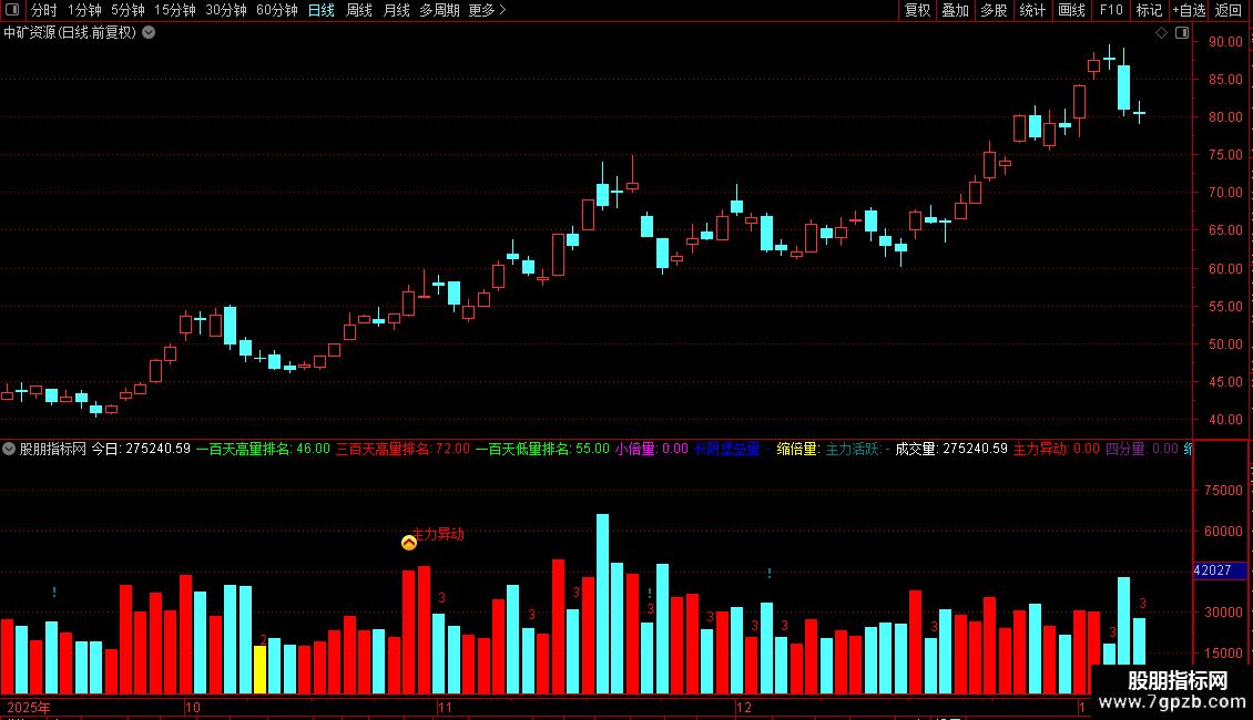 【主力思维量能】绝密买点指标是一款基于成交量分析的专业工具,通过识别多种特殊量能形态来捕捉主力资金动向。该指标核心逻辑在于:量是价的先行指标,通过分析"小倍量"、"缩倍量"、"百日低量"、"四分量"等特殊量价形态,结合"主力异动"信号(V5上穿V35且放量),精准识别主力建仓和启动点。