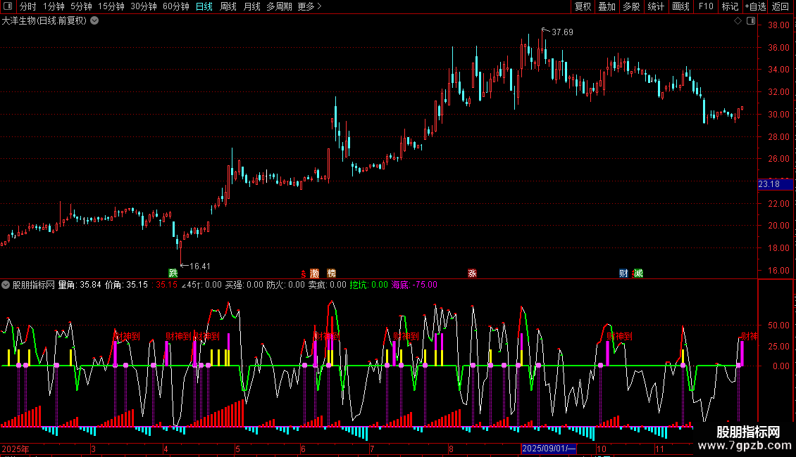 海底:IF(MA5角度<0-75,0-50,0-75),COLORFF00FF,LINETHICK2;