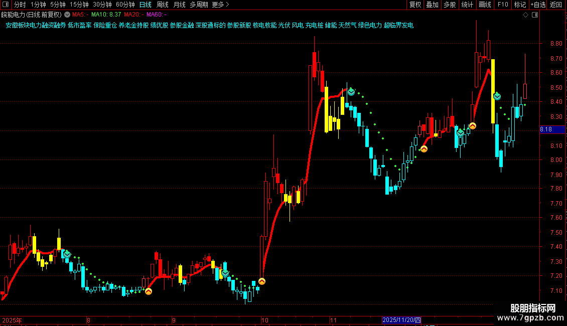 指标通过构建一条动态变化的参考线,结合价格与趋势的交叉关系,辅助判断波段操作的买卖时机。当股价上穿关键支撑线且处于多头状态时,K线以蓝色高亮显示,提示可能进入上涨波段;反之,若股价跌破该线,则以黄色标识,警示调整风险。同时,指标在主图上直接标注“买入准备”和“卖出准备”的图标信号,便于投资者在趋势拐点附近及时行动。整体适合中短线波段交易,强调顺势而为、跟随趋势。