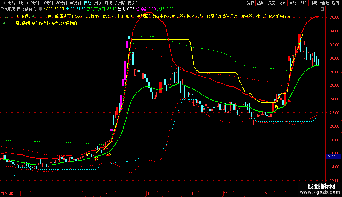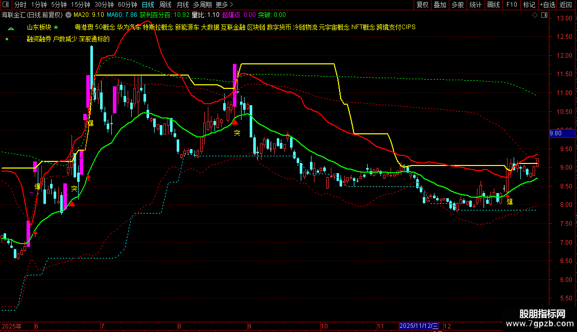 当图表出现黄色"爆"字图标时,意味着股价同时突破技术箱体与筹码压力,伴随成交量放大,是强烈的启动信号。此时结合中轨(绿色均线)趋势向上,可积极关注。若出现"突"字标记,则提示股价突破历史密集筹码区,后市空间打开。