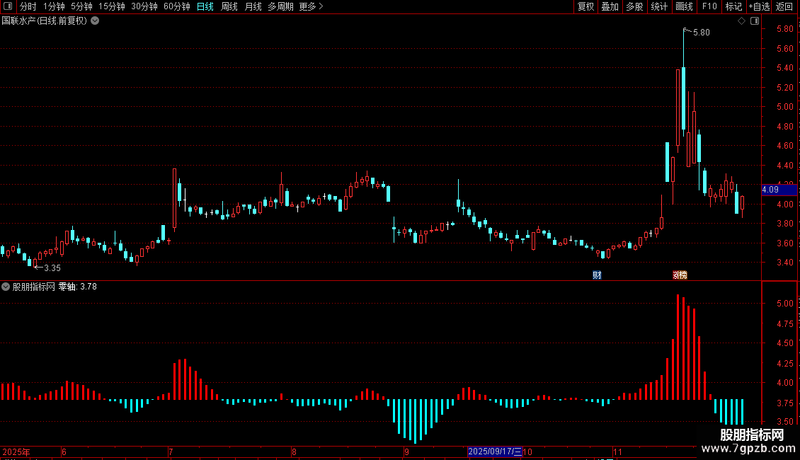 STICKLINE(MACDZ>0,MACDZ*4+零轴,零轴,1,0),COLORRED;