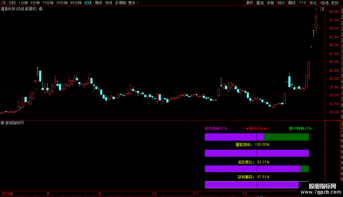 这个“筹码透市”指标不仅简单易懂,而且非常实用。它通过直观的进度条和文字描述,让家人们能够迅速把握市场的动态。举个梨子:当看到机构持仓占比的进度条比较长,且获利筹码占比适中,量能也呈现出饱和状态时,那就说明当前股价的筹码结构非常健康,是一个值得关注的优质标的。如下图所示: