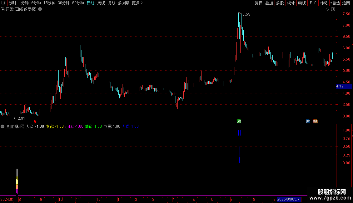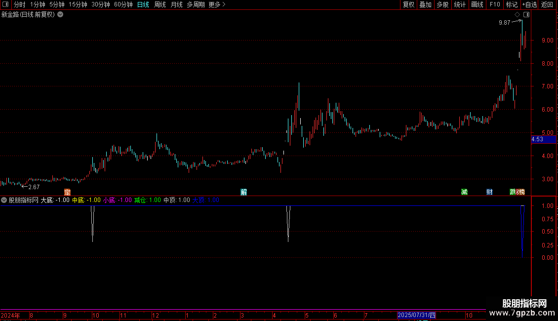 X:=MA(AMOUNT,5)/MA(V,5)/100; VAR3:=(X-MA(AMOUNT,125)/MA(V,125)/100)/X; VAR4:=MA((LLV(L,45)-C)/(HHV(H,45)-LLV(L,45))*100,3); VAR5:=C/MA(C,60)-1; 大底:IF(CROSS(-5,VAR4) AND VAR3<-0.4,-0.01,-1); 中底:IF(CROSS(-5,VAR4) AND VAR3<-0.25 AND VAR3>-0.4,-0.3,-1); 小底:IF(CROSS(-5,VAR4) AND VAR3<-0.15 AND VAR3>-0.25,-0.6,-1); 减仓:IF(CROSS(VAR4,-95) AND VAR5<0.2 AND VAR5>=0.1,0.6,1); 中顶:IF(CROSS(VAR4,-95) AND VAR5<0.35 AND VAR5>=0.2,0.3,1); 大顶:IF(CROSS(VAR4,-95) AND VAR5>=0.35,0,1);