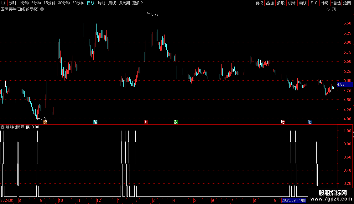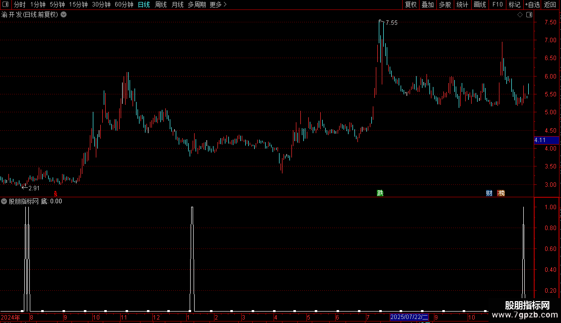 RSV1:=(CLOSE-LLV(LOW,21))/(HHV(HIGH,21)-LLV(LOW,21))*100; RSV2:=(CLOSE-LLV(LOW,37))/(HHV(HIGH,37)-LLV(LOW,37))*100; 短线:=SMA(SMA(RSV1,3,1),3,1)+3*STD(CLOSE,21),COLOR00FF00;中线:=SMA(RSV2,5,1)+2*STD(CLOSE,37),colorred; RSV3:=(CLOSE-LLV(LOW,55))/(HHV(HIGH,55)-LLV(LOW,55))*100; 长线:=SMA(RSV3,5,1),coloryellow; 中线2:=-100*(HHV(HIGH,40)-CLOSE)/(HHV(HIGH,40)-LLV(LOW,40));底: (CROSS(中线2,-90) AND (长线<中线 AND 长线>REF(长线,1)OR 短线<20 AND 中线<20 AND 长线<20))OR (CROSS(短线,长线)AND 长线<18 AND 长线>REF(长线,1)OR CROSS(长线,5));