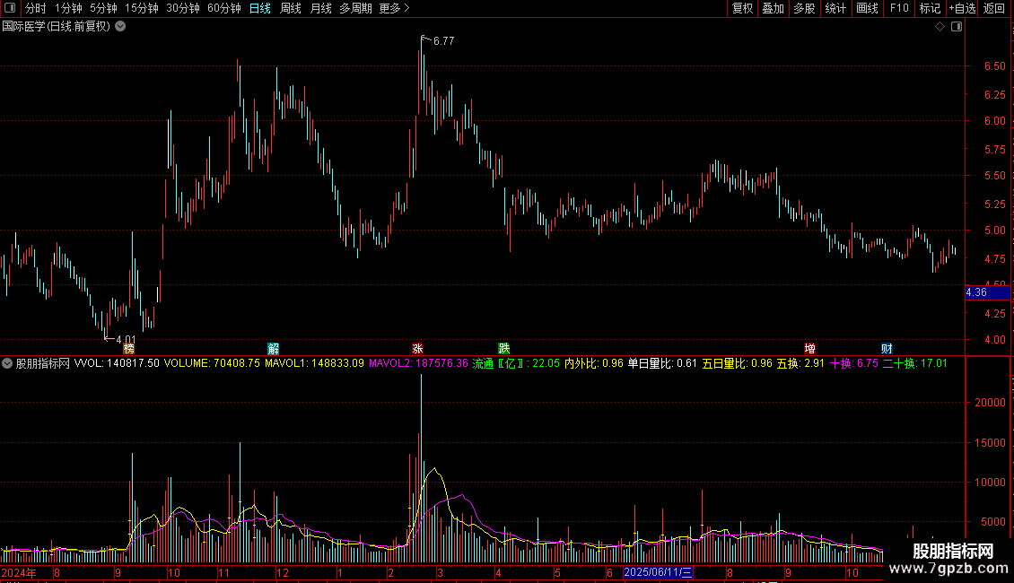 五日量比:V/(REF(MA(V,5),1)/240*FROMOPEN),COLORYELLOW,NODRAW;