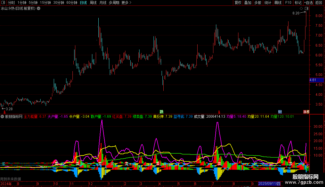 反弹:STICKLINE(主力能量<0 AND 主力能量>=REF(主力能量,1),4.5,4.5+主力能量,1,0),COLOR00CCCC;