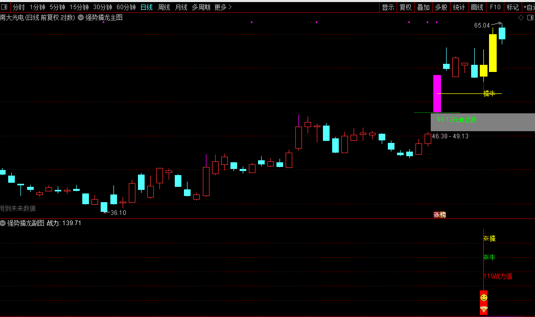 3、选股指标:尾盘2:50分进行选股,然后使用“强势擒龙_副图”进行历史行情排序,选取战力排名第一的个股。