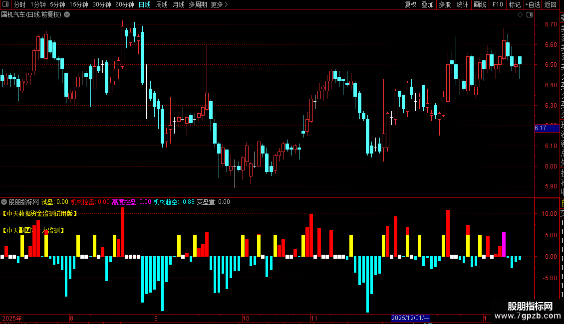 指标主要用于监测主力资金对个股的控盘状态和操作动向。通过双重平滑价格计算出“控盘”力度,结合筹码分布与成本数据,识别主力是否在吸筹、高度控盘、试盘或开始出货。当控盘由负转正时视为试盘信号;持续上升且处于正值区域,代表机构积极介入;若控盘虽为正但开始回落,则提示可能在派发筹码;而控盘为负则反映主力离场或做空意愿。此外,还通过筹码集中度辅助判断控盘强度,并标出变盘过渡期。