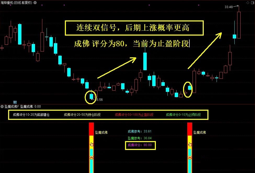 信号出现后观看成佛评分大概会在20附近左右,这个位置为建仓信号,当后期观察成佛评分为20-50之间为持仓阶段,当成佛评分为50以上的时候则为止盈阶段,如果建仓后成佛评分一直再10以下的时候则为止损阶段。当出现双重信号,后期上涨的概率很高。