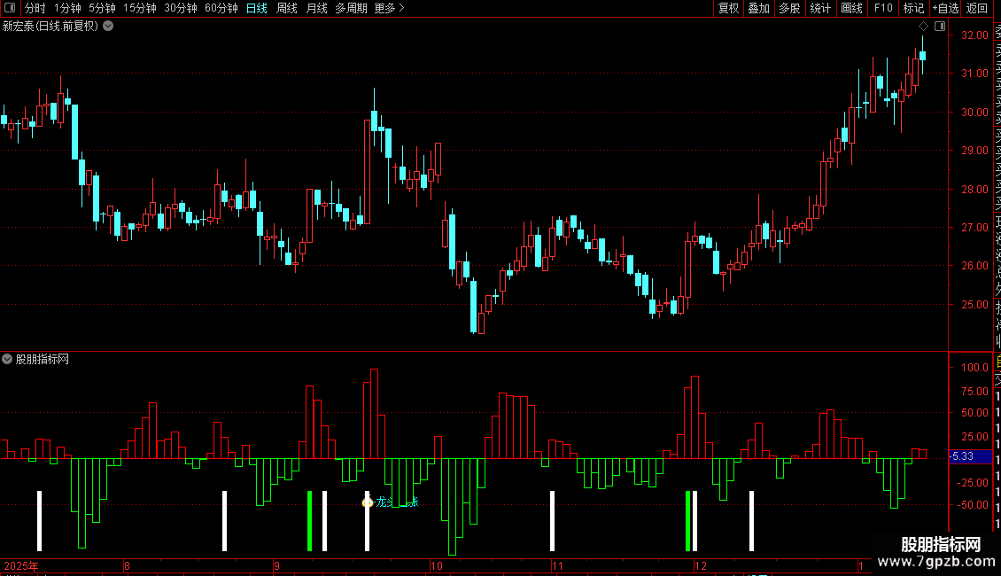 指标主要用于捕捉股价阶段性底部和强势启动信号。通过价格位置、短期动能、量能变化及多类技术指标融合,识别两类关键机会:一是长期下跌后出现的“见底预期”,二是放量突破伴随资金进场的“龙头起涨”信号。当多个条件共振时,系统会以不同颜色的柱状图和文字提示操作时机,辅助判断低吸或追涨点。