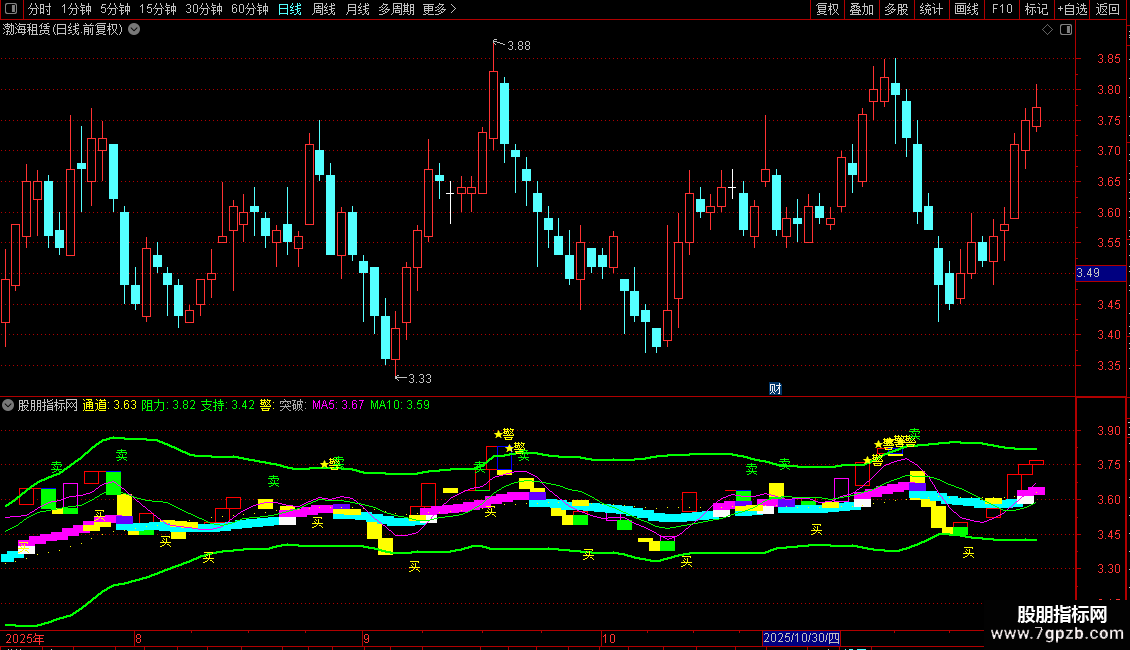 品红变盘:STICKLINE(CLOSE=VAR7 AND VAR3=VAR8, VAR4, CLOSE, 5, 1), COLORMAGENTA;