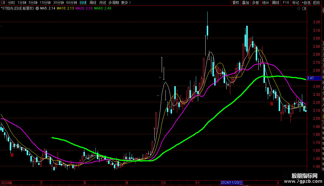 1 分析股票走势时,通过不同均线把握周期趋势:绿色线指示长线趋势,紫色线体现中线趋势,5日和10日均线反映短期波动。