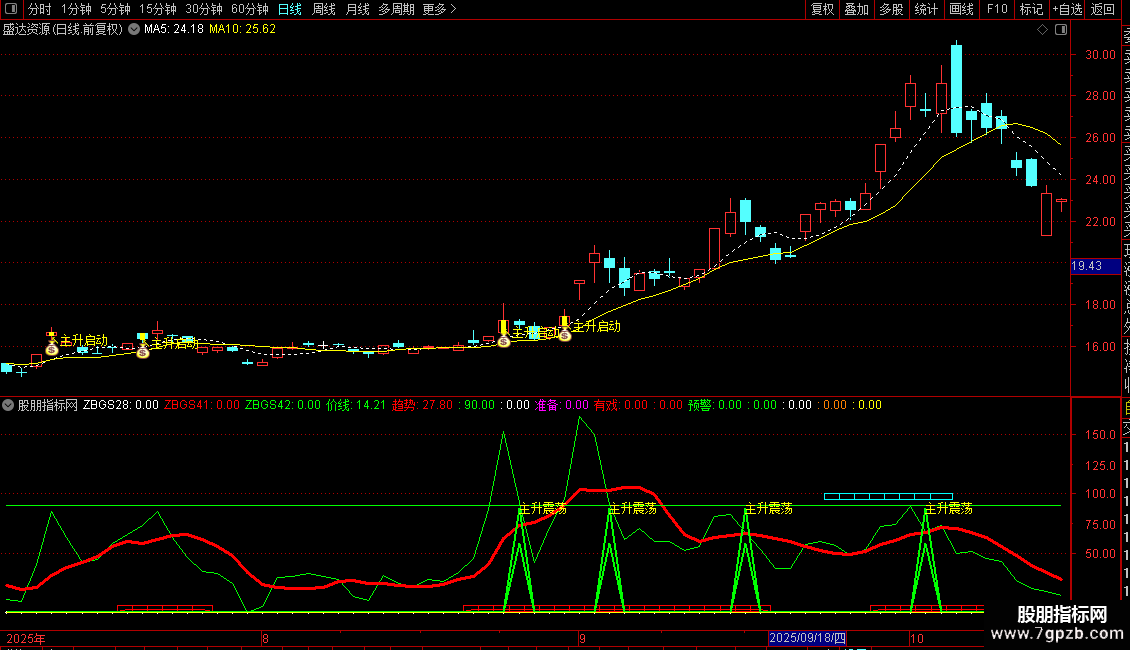 主升中期FT:=(ZBGSZ18)||(CROSS(ZBGSZ3,ZBGSZ4)&&REF(ZBGSZ3,1)< REF(ZBGSZ4,1)&&REF(ZBGSZ4,20)/REF(ZBGSZ4,1)>1.15);