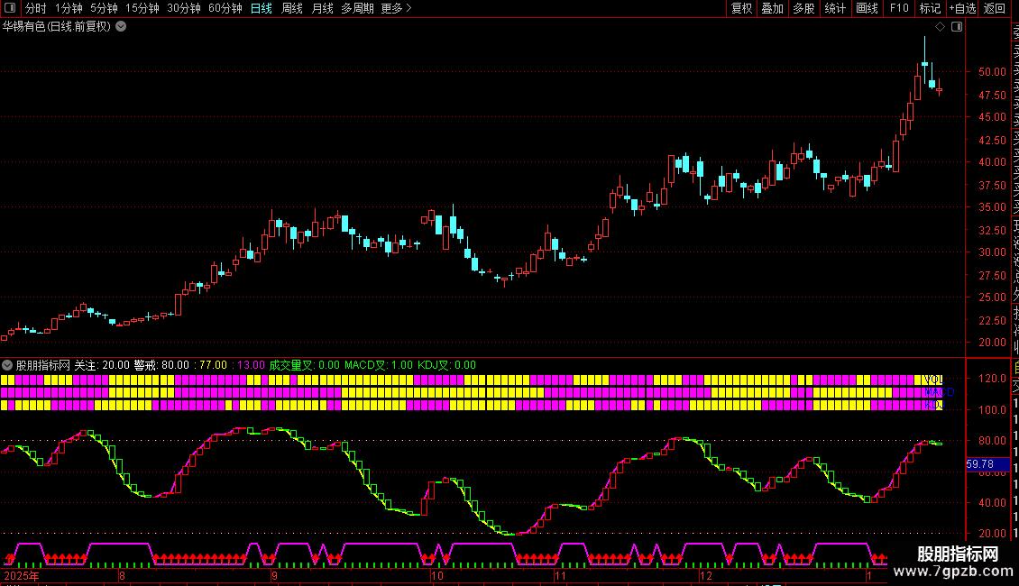 指标融合价格波段、成交量、MACD和KDJ三大信号,通过颜色与柱状图直观展示多空状态。主波段线反映价格在近期高低区间中的相对位置,并用红绿柱区分涨跌动能;同时在高位区和低位区设置警戒与关注线,辅助判断极端情绪。下方三个模块分别显示量能、趋势和超买超卖状态,三者同步向上时视为强势信号,反之则偏弱。操作上可结合多个模块共振作为买卖依据。