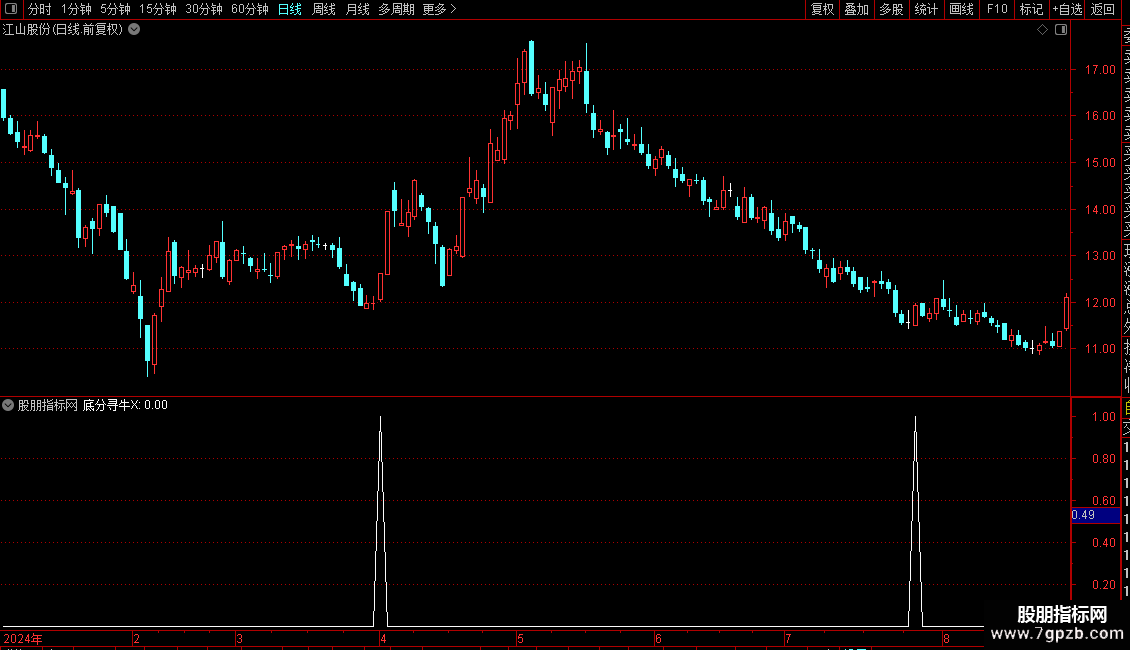 VAR10:=COUNT(VAR2,8)>=3 AND COUNT(VAR3 OR VAR4,7)<=2 AND LLVBARS(L,8)=2 AND HHVBARS(VAR1,8)>=7 AND VAR6;