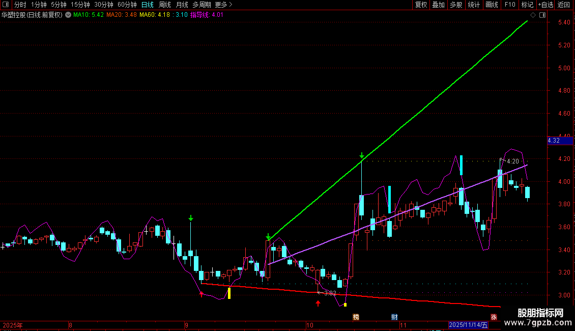 指导线:重心+GAO*(RSI-0.5),COLORMAGENTA,LINETHICK1;