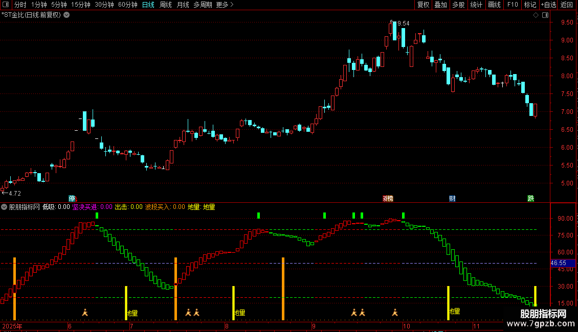 地量:DRAWTEXT(CROSS(0.9,1/VOL*1000>0.01 AND J<0),L*1,'地量'),COLOR00FFFF;