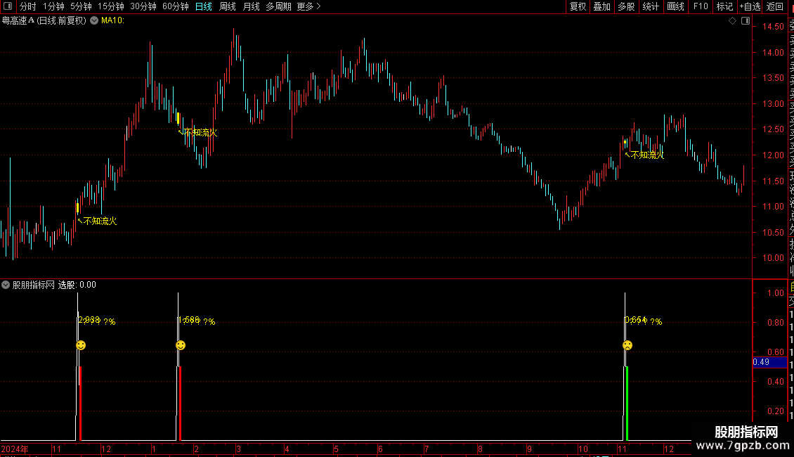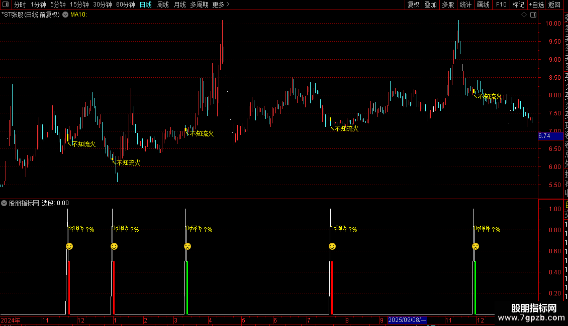 2. 文字标注:在信号K线下方显示"↖不知流火"提示