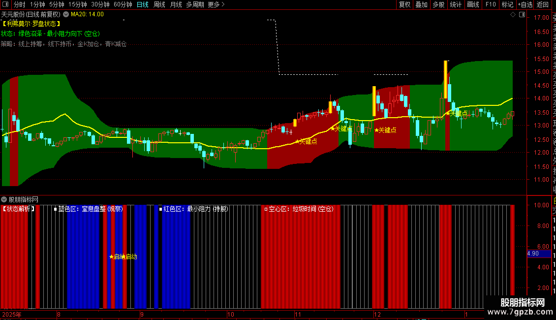 功能:独创的色块指标。蓝色代表“蓄势(盯盘)”,红色代表“主升(持股)”,灰色代表“垃圾时间(休息)”。