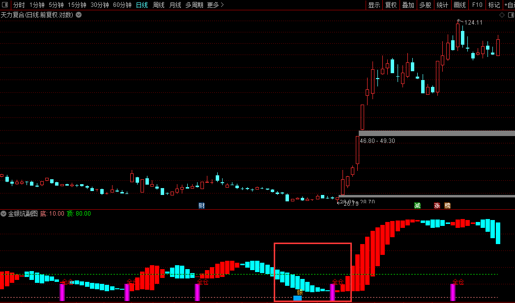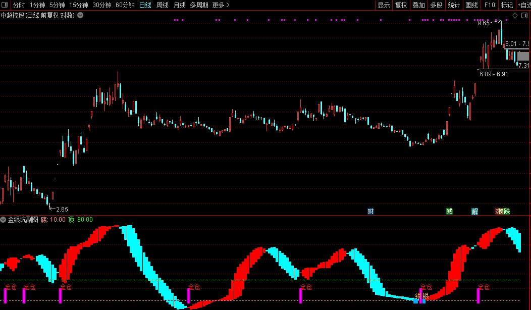 本指标“金银坑”包含1幅副图及选股功能,旨在辅助识别市场底部的三类机会信号。其核心通过结合短期动能与价格偏离度,划分出白银、黄金、钻石三种底部强度等级:当快慢线形成金叉且偏离值达到不同阈值时,分别触发对应级别的信号,并以不同颜色柱体直观标注于副图,同时标注“银”“金”等文字提示。指标还设有红绿柱状线用以展示中期趋势强度,并标注固定超买超卖参考区域,整体帮助使用者更清晰地把握价格低位转折的潜在时机,尤其适用于捕捉下跌后的反弹或反转节点。当出现“全仓”信号前几日若已有“银”信号出现,往往后续行情表现较为可观。