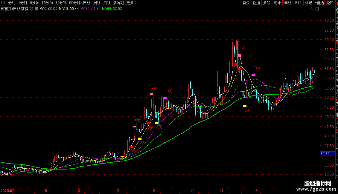 2. 回调天数:涨停后精准标注1-13天回调数字,同步高亮显示3/5/8/13天关键时间窗口,为经典强势股回调周期;