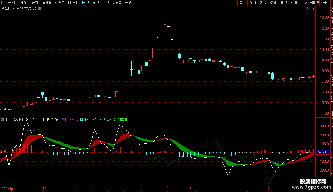 当满足条件MKDD>=1日前的MKDD并且MKDD<=0时,在0和MKDD位置之间画柱状线,宽度为0.5,0不为0则画空心柱.,画青色