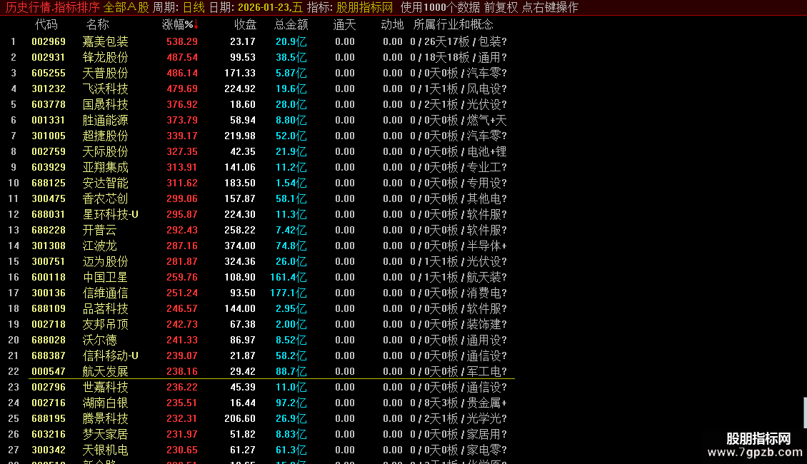 所属行业和概念:DRAWTEXT_FIX(C>0,1,0,1,STRCAT(M2,STRCAT(STRCAT(HYBLOCK,'+'),GNBLOCK))),COLORRED;