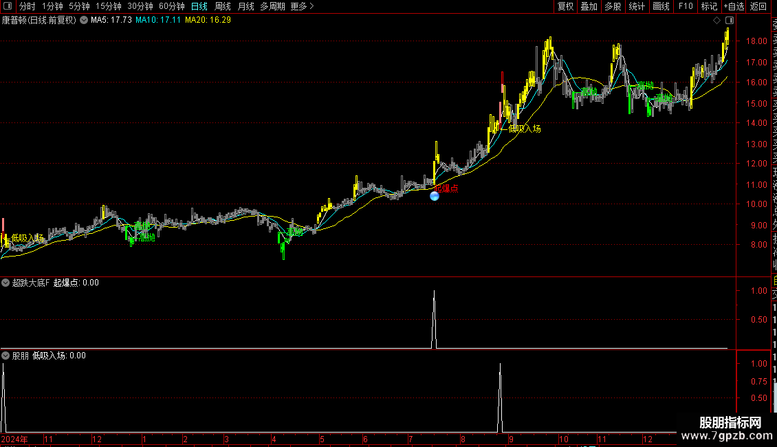 指标通过多条均线与价格区间划分,将市场状态分为五个等级,并用不同颜色的K线直观显示当前所处位置:低位、震荡、高位等。结合成交量、价格突破和短期动量信号,在特定条件组合下提示“低吸入场”“高抛”或“主力拉升”等操作时机。另设“起爆点”信号,用于捕捉放量突破关键压力位且接近涨停的强势启动行情。
