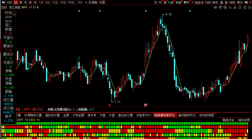 指标通过整合主力资金动向、成交量结构、MACD趋势、OBV能量潮及多周期均线系统,综合判断市场强弱。当多个维度同步发出积极信号(如大单净流入、均笔量放大、MACD金叉、OBV上行、均线多头排列等)时,视为强势买入时机;反之则提示谨慎或离场。策略核心在于“多因子共振”,强调一致性确认以提高胜率。