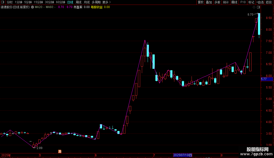 当满足条件LD时,在最低价位置画直线起点,当满足条件HD时,在最高价位置画直线终点,0表示是否延长.,画洋红色,线宽为1