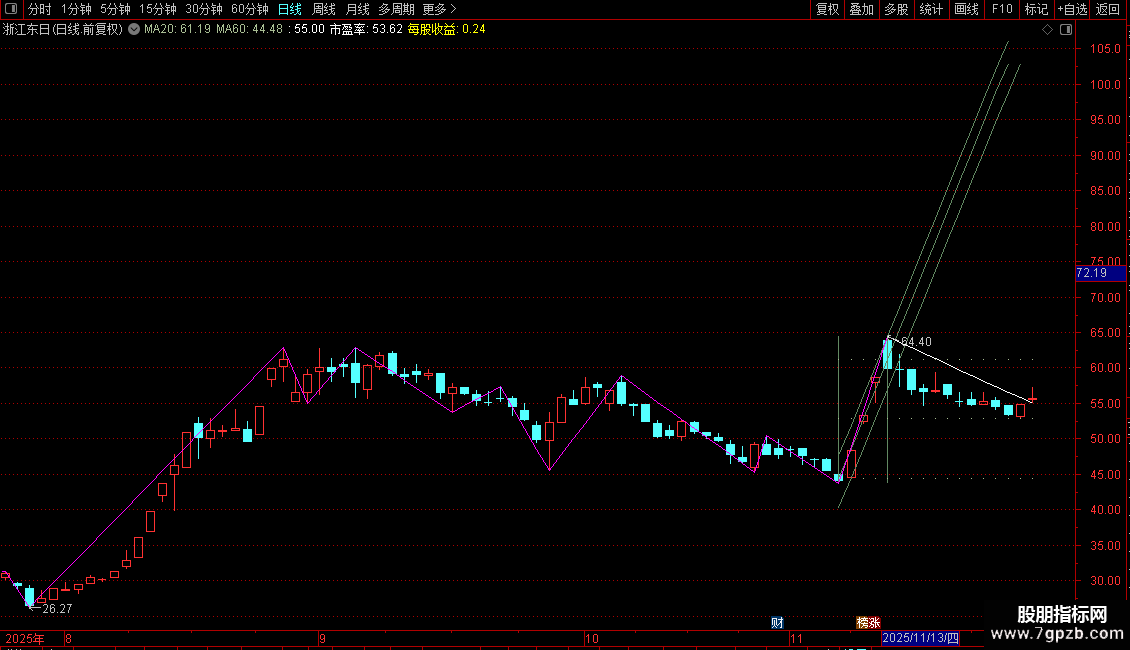 当满足条件J2时,在如果HD,返回最高价,否则返回最低价位置画直线起点,当满足条件是否最后一个周期时,在如果上次HD距今天数>上次LD距今天数,返回最高价,否则返回最低价位置画直线终点,0表示是否延长.,画白色,线宽为1