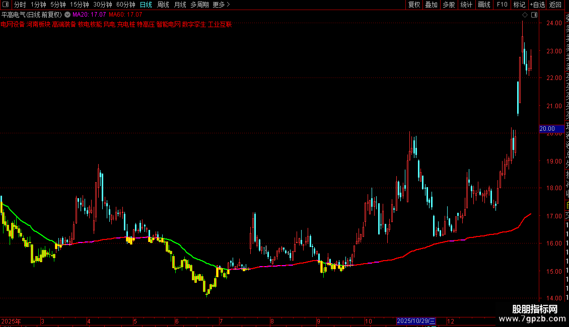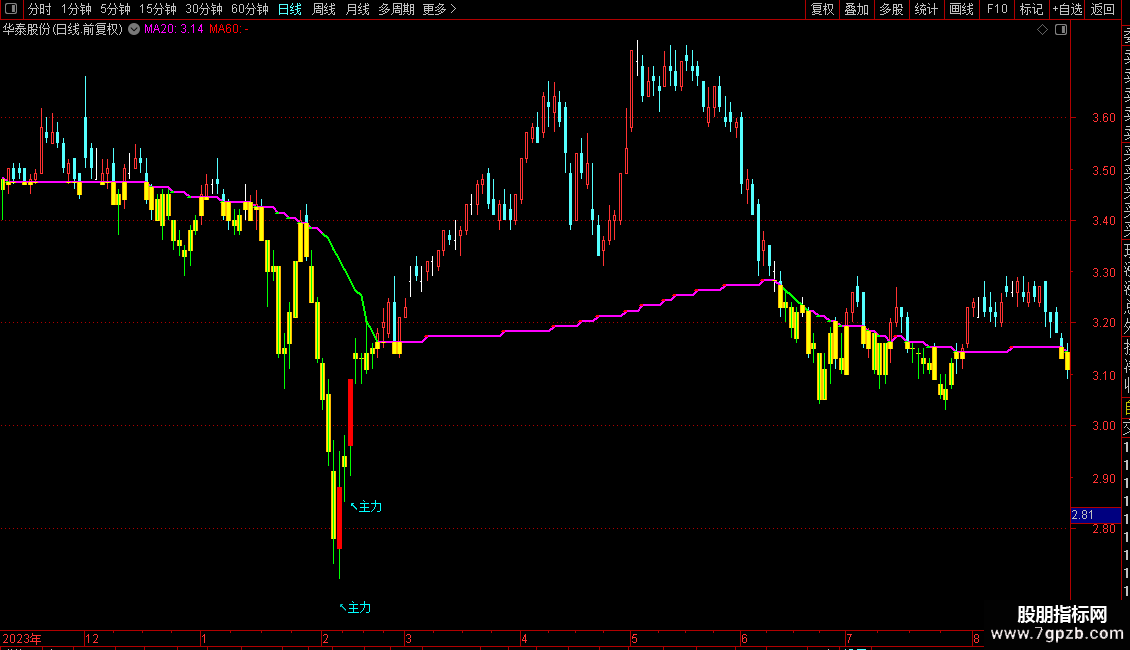 STICKLINE(成本价>LOW AND 成本价< HIGH,成本价,MIN(MIN(OPEN,HG0),成本价),0.3,0)*HG4,COLOR00FFFF;