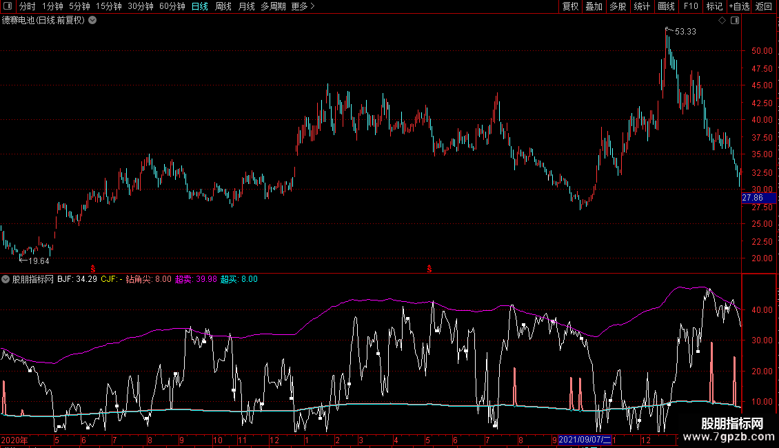 钻角尖:POW((JRB/5-REF(JRB/5,1)),8)*8000+JRB/5,COLORLIRED,LINETHICK2;