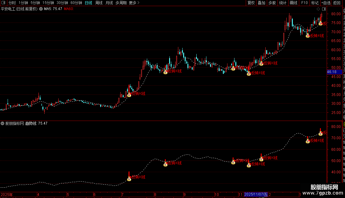 1. 主图:加载后观察带红柱和图标标记的K线,代表当日满足反转条件;