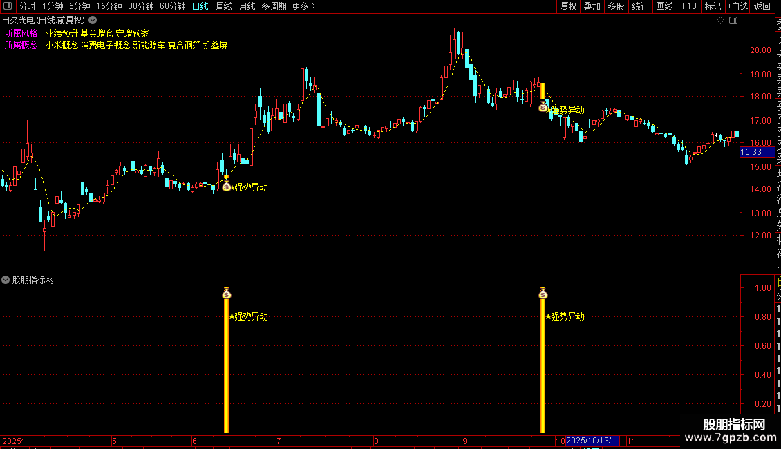 指标主要用于识别A股市场中具有“强势异动”特征的个股。它结合了量价关系、资金活跃度与短期均线趋势,通过分析成交量在不同K线形态下的分布,判断主力资金是否异常介入;同时叠加价格变动幅度、换手率及特定均线排列条件,筛选出处于下跌或震荡末期、但出现放量且技术面转强的股票。当多个条件共振时,系统会发出明确的买入提示信号,并以醒目标记和图标高亮显示。