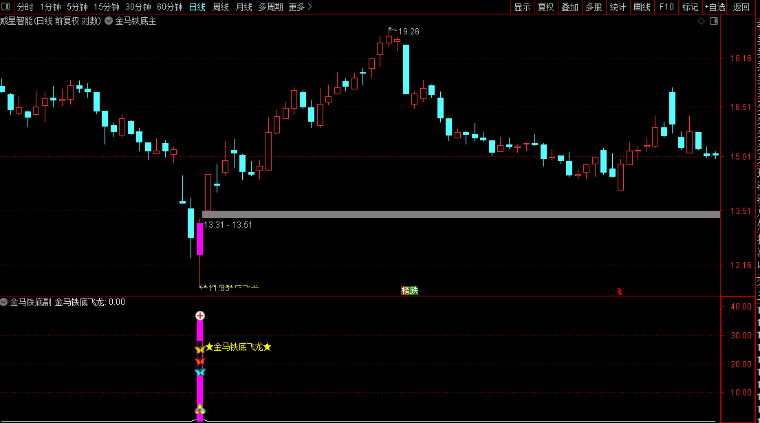 金马铁底飞龙指标是一款专为捕捉股价深度回调后的强势反弹信号而设计的量化指标,底部成功率很高,信号较少且比较集中,往往信号出现时就是大底部。