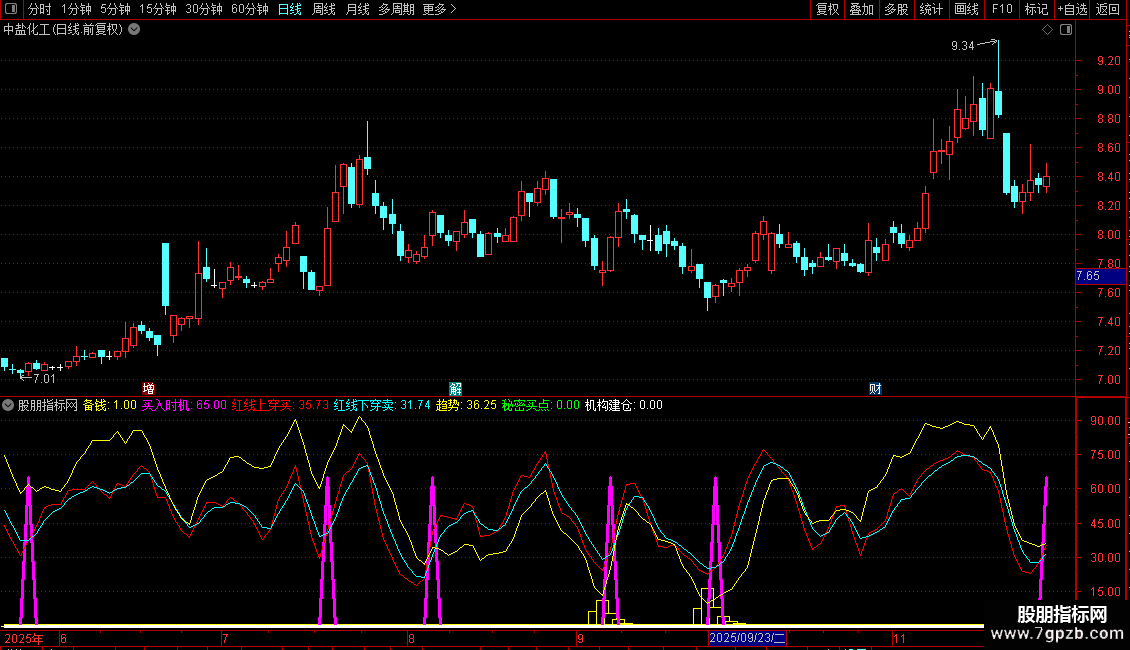 买入时机: IF(CROSS(J,3),65,0),COLORFF00FF,LINETHICK3;