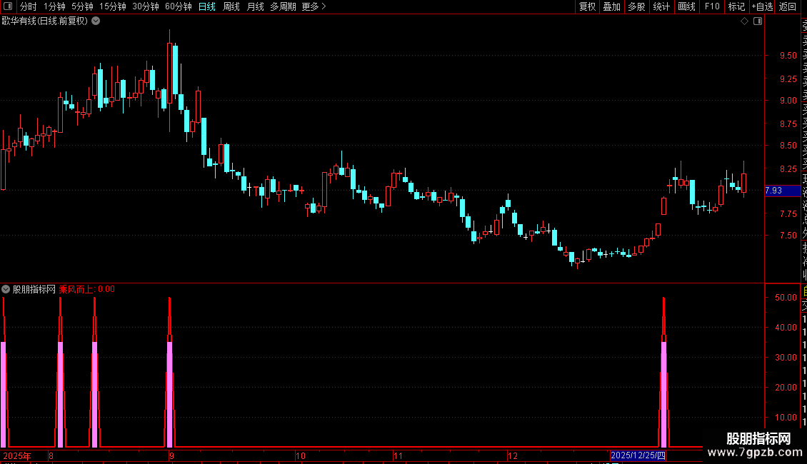 1. 指标副图中出现蓝色柱状(数值50)、粉色柱体叠加黄色“★乘风而上”图标时,为明确买入信号,代表个股符合上升趋势且短线启动条件;