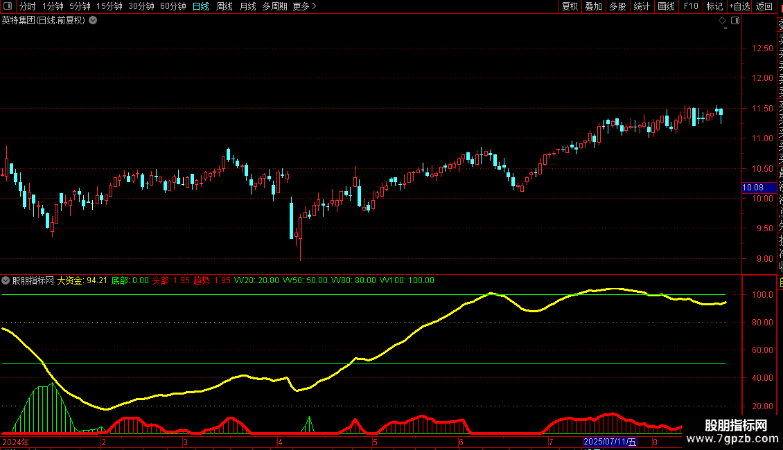指标主要通过价格在一定周期内的相对位置,结合成交量加权均价的差异,来判断市场所处的高低位置及主力资金动向。当指标显示“底部”信号时,意味着价格处于阶段性低位,可能存在反弹机会;“头部”和“趋势”部分则反映资金流出或高位压力,提示潜在回调风险;“大资金”线用于观察主力活跃程度,数值变化可辅助判断市场强弱。整体策略偏向于低吸高抛,适合震荡市中捕捉波段机会。
