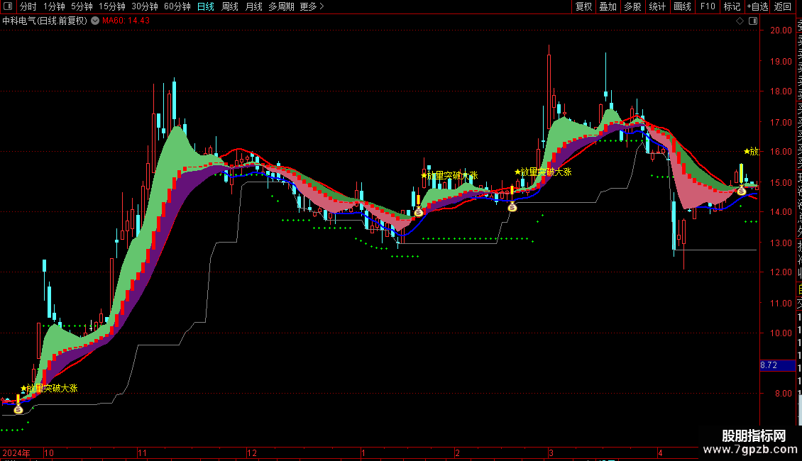 指标主要围绕价格趋势、主力行为和风险控制三方面构建操作参考。通过多周期均线系统识别底部区域与趋势方向,结合主力筹码动向判断资金介入强度;同时设置基于近期高点的多级止损线,辅助控制回撤风险。当价格放量突破关键阻力、主力筹码上穿趋势线且短期动能增强时,视为有效买入信号。