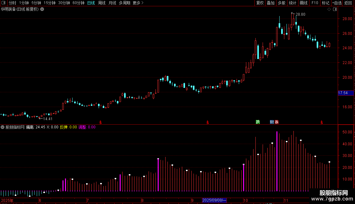 偏离:(CLOSE/MA(CLOSE,120)-1)*100,COLORSTICK;