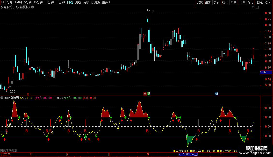 DRAWTEXT(CURRBARSCOUNT=45,-400/1.5,'使用 :CCI>100 时,买进,CCI<100 时,卖出;