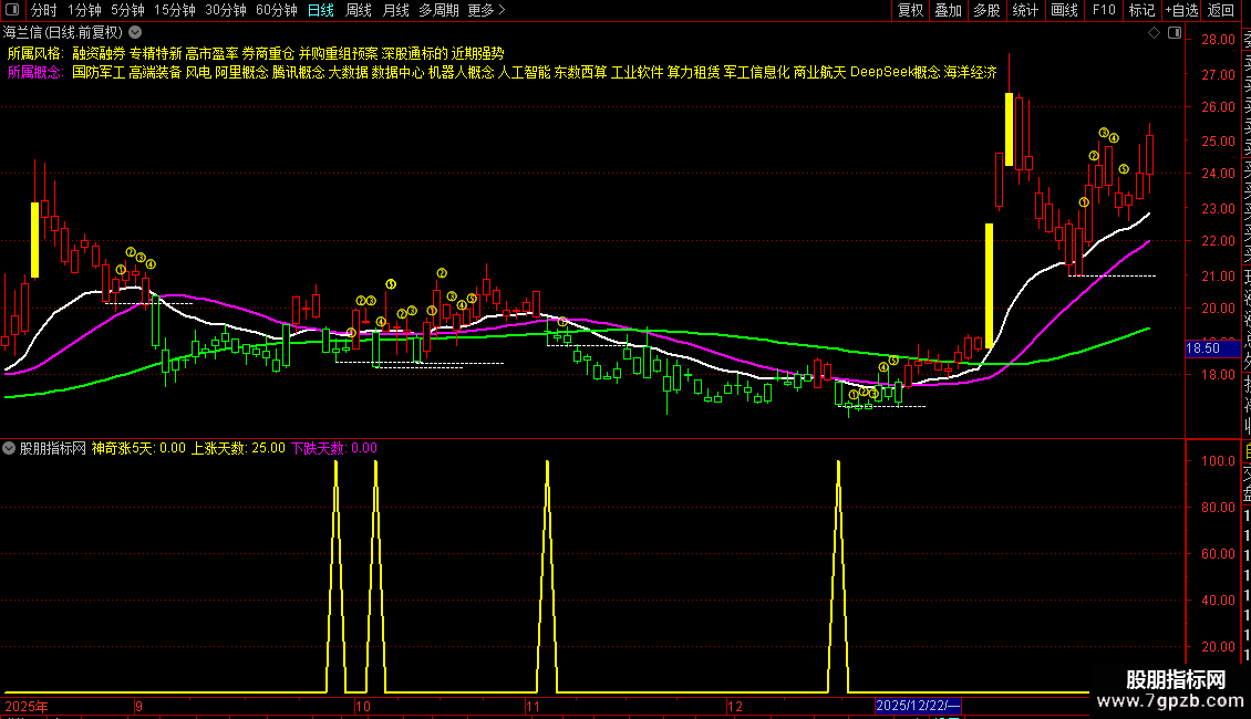 神奇涨5天:IF(X_35 AND X_40 AND X_41 AND X_42 AND X_43 AND X_46,100,0),COLORYELLOW,LINETHICK2;