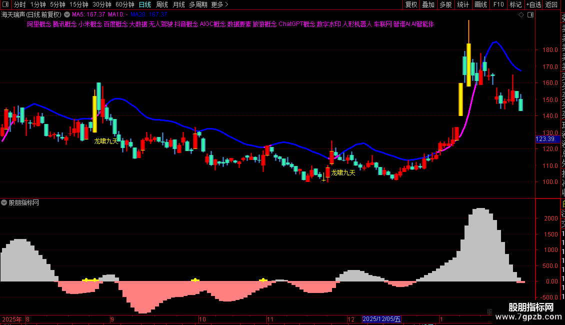 主图指标通过动态均线(WEKR)区分多空趋势,并以鲜明色彩标识强弱;当股价放量突破WEKR且涨幅超7%,系统自动标注“龙啸九天”信号,提示主力启动。