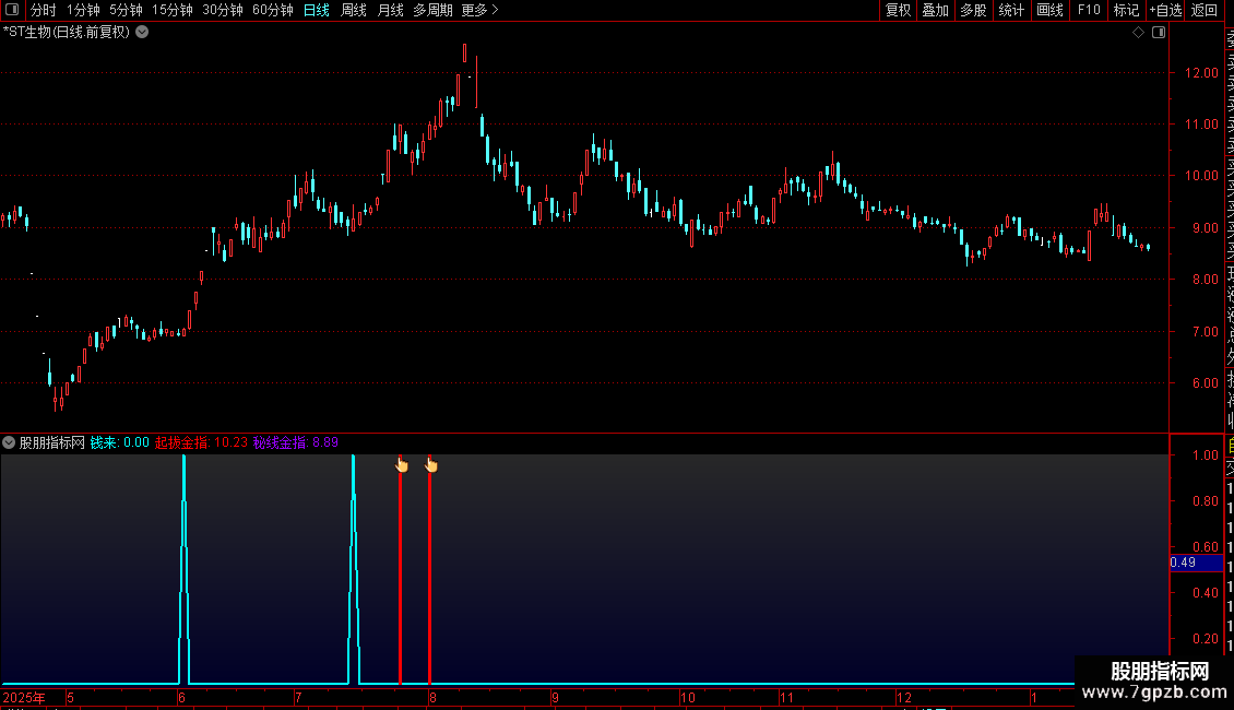 - 青色“钱来”指标线:代表量价动能同步突破,是资金异动的核心信号;