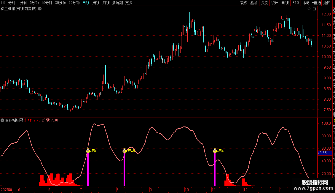 2. 紫色柱子预示启动在即,处于行情启动的临界点——意味着吸筹完成,多头蓄势待发,可筛选即将进入主升浪的标的。
