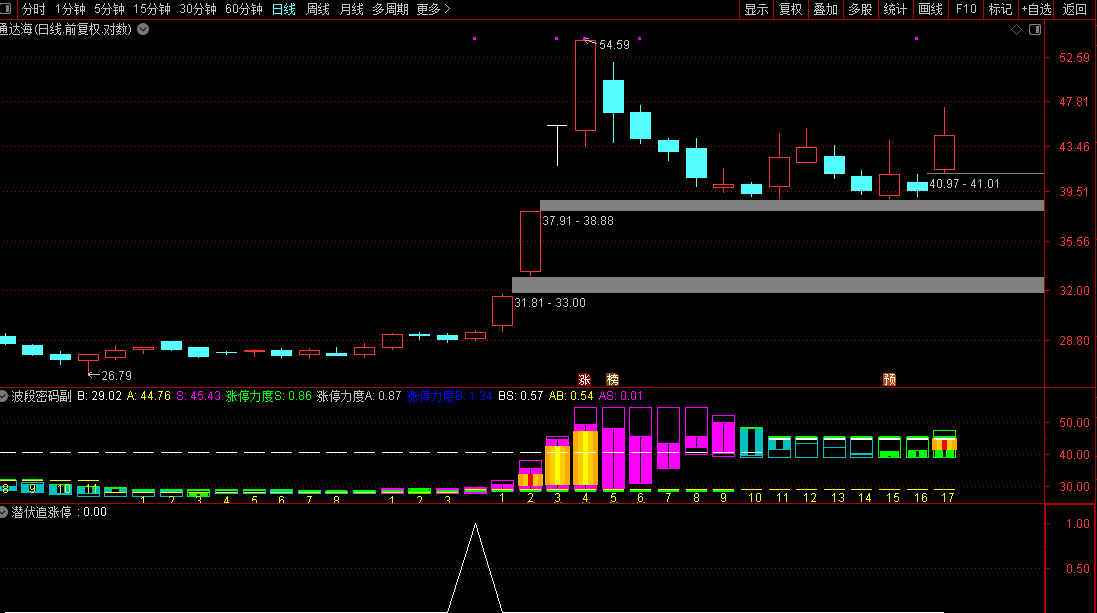 波段密码副图这是一个给炒股老手用的“K线增强插件”。它会把普通的K线图重新“化妆”,用更醒目的颜色告诉你现在是强势还是弱势——紫色代表主力在拉,蓝色代表力道不够。它会自动算出三根关键的生命线(B线、S线、A线),就像在地图上标出重要的战略高地。碰到涨停板时,它会放个彩色烟花提醒你;当股价在这些关键线附近徘徊时,它会用数字和图标悄悄提示你该关注了。本质上,这就是个帮你看透盘面语言、抓住关键转折点的智能放大镜。
