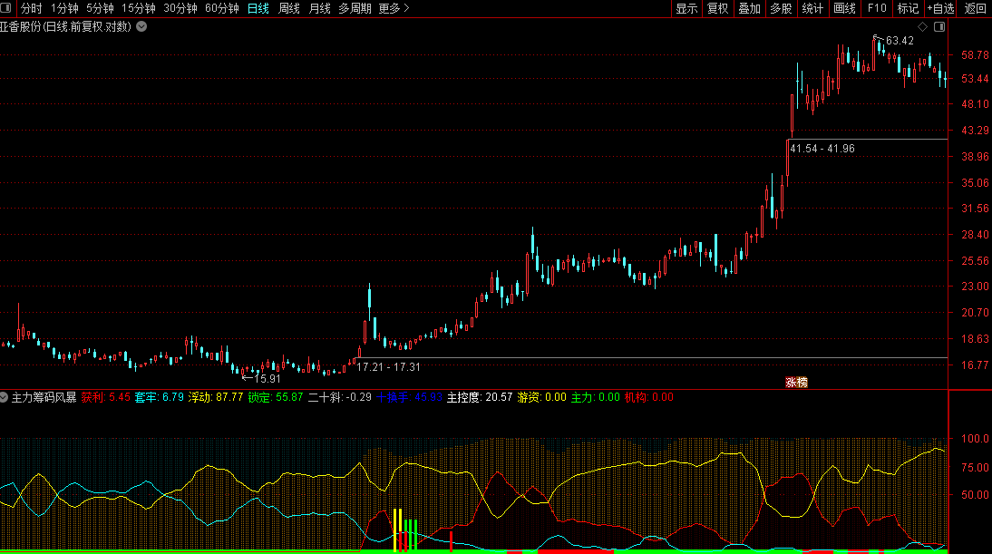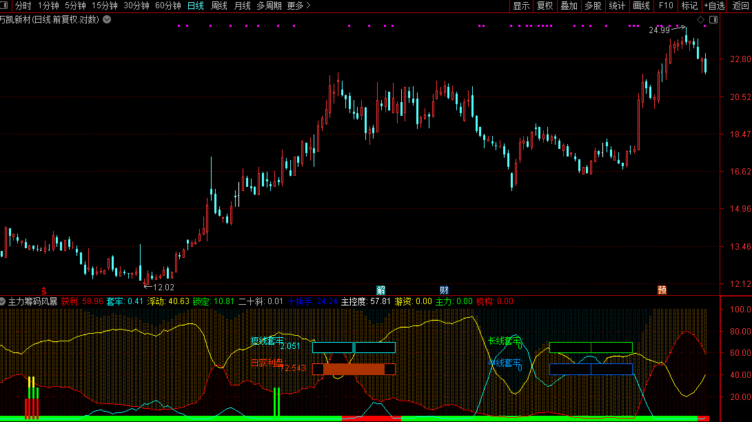 2. 筹码结构判断:获利线(红)走高、套牢线(青)走低,代表筹码趋于集中,多方占优;浮动线(黄)收窄,说明多空分歧减小,趋势将明朗;