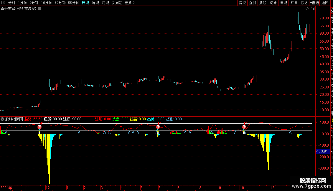 起涨:IF(crOSS(D1,K1),30,0),COLORFFCC66;