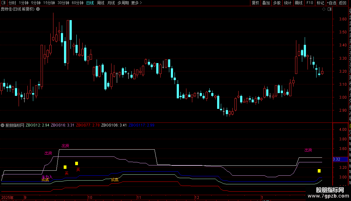 DRAWTEXT(((CROSS(ZBGS1,ZBGS106) AND (LOW <= ZBGS1)) AND ((ZBGS1 - REF(ZBGS1,1)) > 0.02)),(LOW - 0.03),'绝佳买点'),COLORAFA0AF;